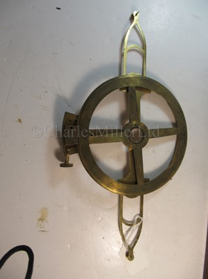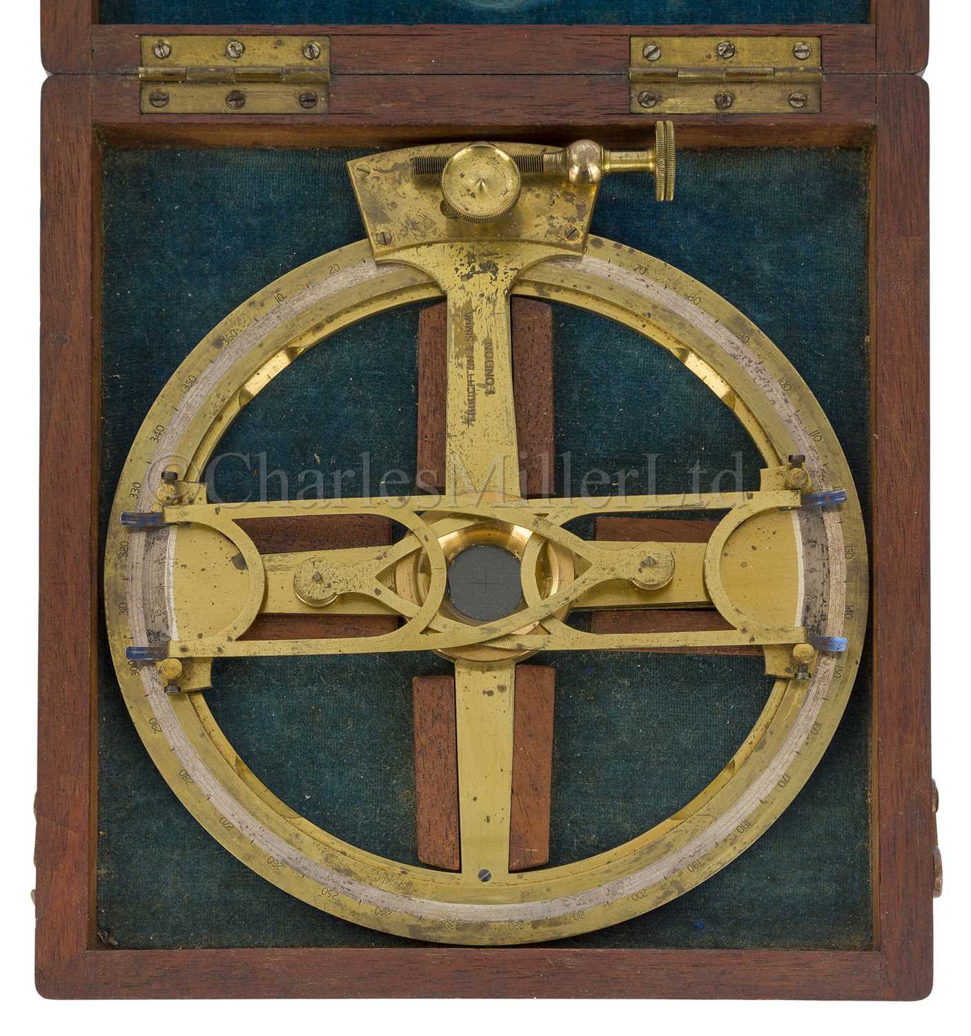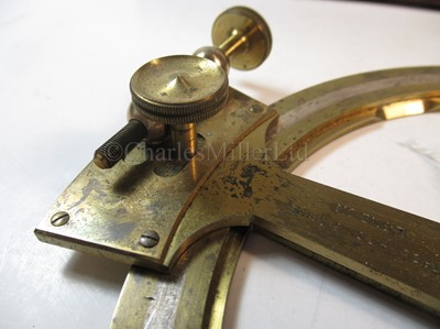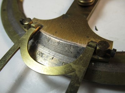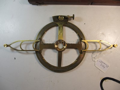 constructed in lacquered brass with inset silvered scale, signed on the clamping arm as per title, opposing vernier arms with folding extensions, contained in plush-lined box of issue -- 8in (20.5cm.) wide